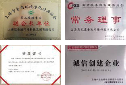 Shanghai Air Duct Industry Association Level A Certificate of Competency | Vice President Unit of Indoor Air Environmental Cleaning Association Indoor air purification industry, a construction unit | China Cleaning Service Association executive director China Top Ten cleaning industry famous brand
